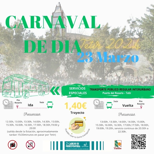 El Cabildo de Fuerteventura, a través de la Consejería de Transportes y la empresa que presta el servicio de transporte regular interurbano de viajeros Tiadhe, establece servicios especiales de guaguas con motivo del Carnaval de Día de Tetir que se celebra el sábado 23 de marzo, para garantizar la seguridad en el traslado y evacuación de asistentes, además de promoción del transporte público seguro.