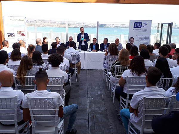 El presidente del Cabildo de Fuerteventura, Marcial Morales, el consejero de Empleo, Rafael Páez, el director general de Juventud del Gobierno de Canarias, Sergio Eiroa, y el alcalde de Puerto del Rosario, Nicolás Gutiérrez, recibieron hoy, 4 de octubre, a estos 195, con edades comprendidas entre los 16 y 30 años en un acto que se celebró en el Hotel Escuela El Mirador y que contó con la asistencia de representantes de ayuntamientos y asociaciones empresariales, entre otros.