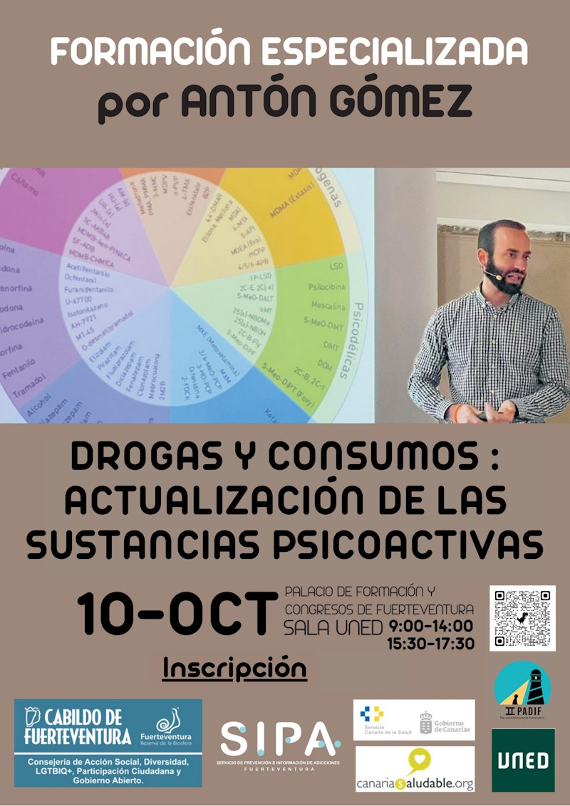 El Cabildo de Fuerteventura, a través del Servicio de Prevención e Información de Adicciones (SIPA) de la Consejería de Acción Social, ofrecerá el próximo 10 de octubre la formación ‘Drogas y consumos: actualización de las sustancias psicoactivas’, que será impartida por el experto Antón Gómez. La jornada se llevará a cabo en la sala UNED del Palacio de Formación y Congresos de Fuerteventura, de 9:00 a 14:00 horas y de 15:30 a 17:00 horas.