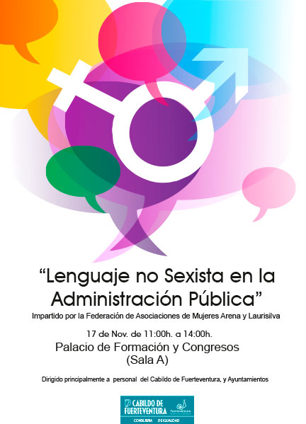 El Cabildo de Fuerteventura, a través de su Consejería de Igualdad, que dirige Yanira Domínguez, organiza un taller sobre uso del lenguaje no sexista en la administración pública dirigido a personal del Cabildo, ayuntamientos y público general. La formación se impartirá el próximo 17 de noviembre, en la Sala A del Palacio de Formación y Congresos de Fuerteventura, en horario de 11.00 a 14.00 horas. Por su parte, la formación dirigida a cargos de la administración tendrá lugar de 17.00 a 19.00 horas.