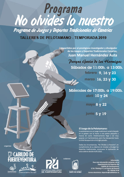 El Cabildo de Fuerteventura inicia este sábado, día 9 de febrero, la temporada de 2019 del Taller de Pelotamano, que imparte dentro del programa de recuperación, conservación y difusión de los juegos y deportes tradicionales de la Consejería de Deportes, ‘No Olvides Lo Nuestro’. El taller se desarrollará en horario de 11.00 a 13.00 horas, en el Parque Gavia Los Hormiga del barrio de El Charco, en Puerto del Rosario, gracias a la colaboración del Ayuntamiento de Puerto del Rosario, que cede el uso de dichas instalaciones.