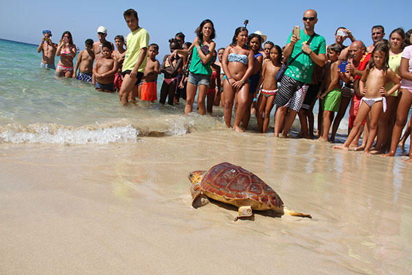 Numerosas personas asistieron este miércoles, 24 de agosto a la suelta de una tortuga boba en la Playa de la Cebada, en Morro Jable. El Cabildo de Fuerteventura liberó un ejemplar de 12 kilogramos de esta especie en peligro de extinción.