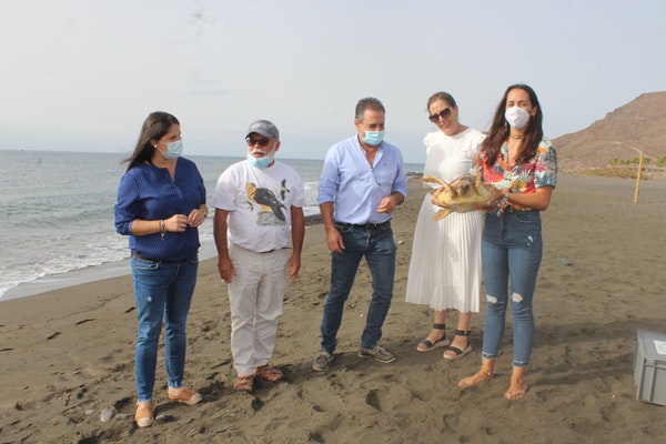 En la suelta de la tortuga estuvieron presentes la consejera de Medio Ambiente del Cabildo de Fuerteventura, Marlene Figueroa, la alcaldesa de Tuineje, Esther Hernández, y el concejal de Medio Ambiente, Vicente García.