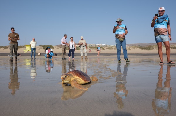 La tortuga ha sido liberada ante la presencia de miembros del Club Deportivo de Montañismo ‘Chimayache’ de Tenerife, club que habitualmente realiza actividades de senderismo en la Isla y que se ha trasladado hasta Fuerteventura en esta ocasión para participar en la suelta.
