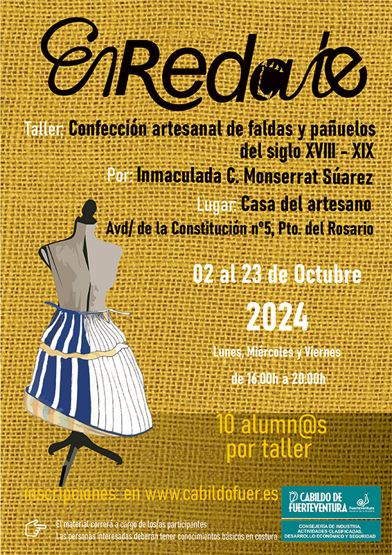 Las plazas son limitadas, con un máximo de 10 alumnos por curso, y los interesados deben tener conocimientos básicos de costura. El plazo de inscripción estará abierto desde hoy hasta el 27 de septiembre de 2024, a través de los siguientes enlaces: www.cabildofuer.es/cabildo/agenda/taller-de-confeccion-artesanal-de-faldas-y-panuelos-del-siglo-xviii-xix/ para el primer taller y www.cabildofuer.es/cabildo/agenda/taller-de-confeccion-artesanal-de-falta-de-campesina-y-complementos-del-siglo-xix-xx/ para el segundo.