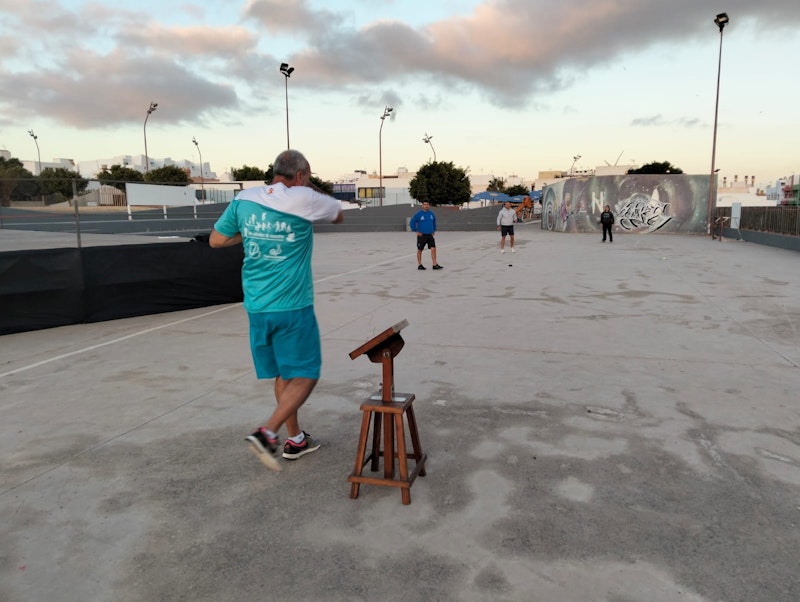 Este juego tradicional canario consiste en golpear con la mano una pequeña pelota maciza de cuero para devolverla al campo contrario antes de dar dos botes en el suelo. Con un diámetro de entre 45 y 47 mm y un peso aproximado de 50 gramos, la pelota está compuesta por un núcleo de tiras de goma recubiertas de hilo de lana y forrada con cordobán (cuero de cabra curtido).