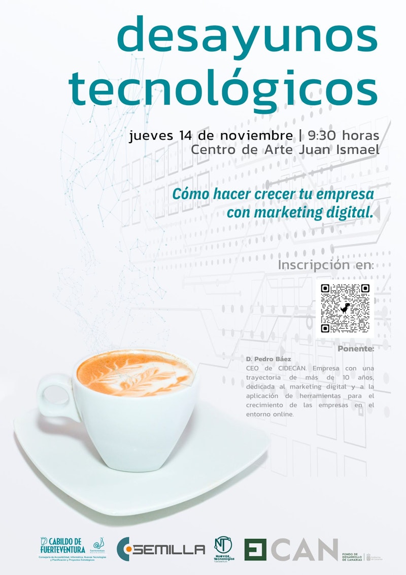 La sesión ‘Cómo hacer crecer tu empresa con marketing digital’ tendrá lugar el 14 de noviembre, a las 9:30 horas, en el Centro de Arte Juan Ismael, en Puerto del Rosario, y contará con la participación del CEO de la empresa especializada CIDECAN, Pedro Báez. El evento incluye un desayuno posterior, donde los participantes podrán interactuar directamente y generar sinergias entre empresarios, autónomos y asistentes interesados.