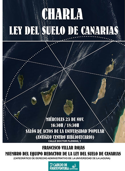 La charla, que impartirá el catedrático de Derecho Administrativo de la Universidad de La Laguna y coordinador del equipo redactor del Proyecto de Ley del Suelo, Francisco J. Villar Rojas, se celebrará el miércoles, día 23 de noviembre, a las 16.30 horas, en el Salón de Actos de la Universidad Popular, antiguo Centro Bibliotecario, en la calle Doctor Fleming, número 1, en Puerto del Rosario.