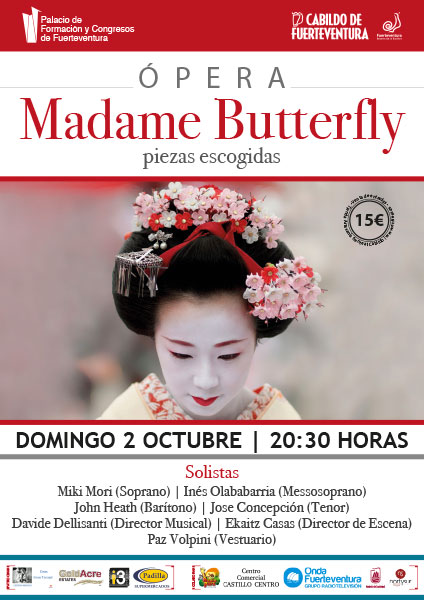 El Cabildo de Fuerteventura pondrá a la venta, a partir de hoy, jueves, 22 de septiembre, las entradas para la ópera ‘Madame Butterfly’, piezas escogidas’, que tendrá lugar el próximo 2 de octubre, a las 20.30 horas, en el Palacio de Formación y Congresos de Fuerteventura. El evento forma parte de los actos programados dentro de la Agenda de Cultura del Cabildo, que coordina Juan Jiménez.