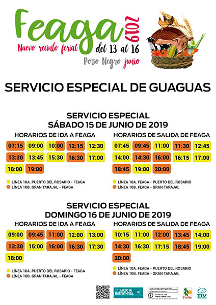 El domingo, día 16 de junio, saldrán guaguas de la Estación de Puerto del Rosario con parada en el recinto ferial de Pozo Negro a las 09.00, 12.00, 13.00, 15.00, 17.30 y 18.00. Del recinto ferial partirán guaguas a las 10.15, 11.00, 14.00, 16.30, 17.15 y 19.00 horas con destino la Estación de Puerto del Rosario.