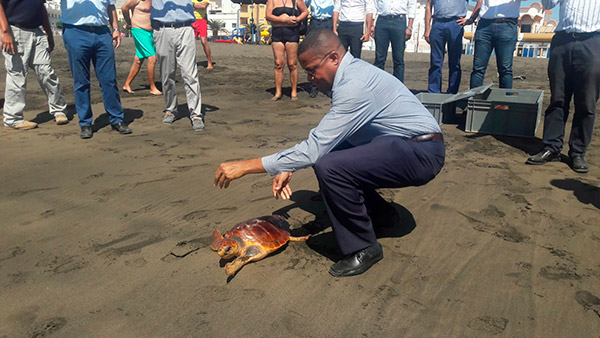 El Cabildo de Fuerteventura ha devuelto al mar dos tortugas en un acto al que se invitó a la representación de la Cámara Municipal de Boa Vista (Cabo Verde) presidida por José Luis Santos, de visita institucional en la Isla esta semana. Durante la suelta, que se desarrolló en Gran Tarajal, en el municipio de Tuineje, técnicos del área de Medio Ambiente del Cabildo, que dirige Natalia Evora, ofrecieron detalles sobre el proceso de recogida de tortugas marinas heridas y su posterior suelta una vez recuperadas. En el acto de la suelta los representantes de Boa Vista estuvieron acompañados por los consejeros de Industria, Promoción Económica y de Agricultura, Ganadería y Pesca José Juan Herrera, Rafael Páez y Juan Estárico, respectivamente.