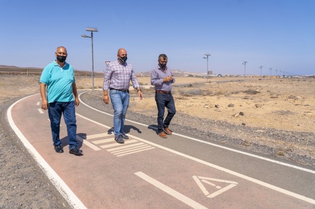 El presidente del Cabildo de Fuerteventura, Sergio Lloret López, junto con el consejero de Industria y Energía, Domingo Pérez Saavaedra, y el concejal de Nuevas Tecnologías de Antigua, Agustín Rodríguez Cabrera, han firmado hoy miércoles el acta de entrega de la obra promovida por la Institución insular para dotar de alumbrado público solar al carril bici El Castillo-Las Salinas del Carmen. Esta actuación ha tenido un coste económico de 139.936 euros y ha sido sufragada con cargo al Fondo de Desarrollo de Canarias (FDCAN).