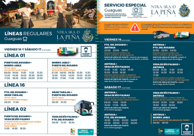 El Cabildo de Fuerteventura, a través de la Consejería de Transporte y la empresa que presta el servicio público insular de guaguas, Tiadhe, ha establecido una programación especial de guaguas con motivo de la celebración de las Fiestas en Honor a Nuestra Señora de La Peña.