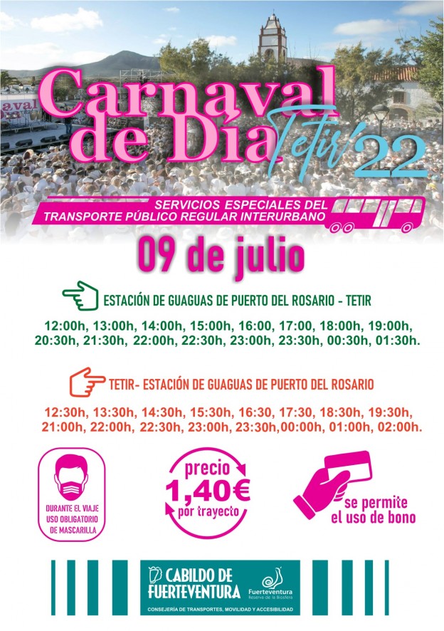 El Cabildo de Fuerteventura, a través de la Consejería de Transportes y la empresa que presta el servicio de transportes regular interurbano de viajeros, Tiadhe, establece servicios especiales de guaguas con motivo del Carnaval de Día de Tetir, que se celebra este sábado, día 9 de julio.