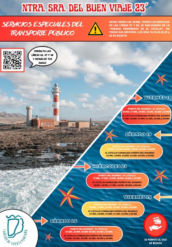El Cabildo de Fuerteventura, a través del área de Transportes, que dirige Luis González, y la empresa concesionaria del transporte interurbano Tiadhe, refuerzan los horarios de las líneas 7 y 8 del servicio de transporte regular interurbano de viajeros, con motivos de las fiestas en honor a Nuestra Señora del Buen Viaje que se celebrarán en El Cotillo del 15 al 27 de agosto de 2023.