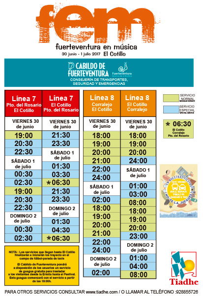 El Cabildo de Fuerteventura, a través de la Consejería de Transportes, que dirige José Roque Pérez, y la empresa que presta el servicio de transportes regular interurbano de viajeros, Tiadhe, han establecido una programación especial de guaguas para este viernes, día 30 de junio, el sábado, día 1 de julio, y la madrugada del domingo, día 2 de julio, para facilitar al público la asistencia al Festival Fuerteventura en Música 2017 (FEM), que se celebra esos días en la playa de La Concha, en El Cotillo.
