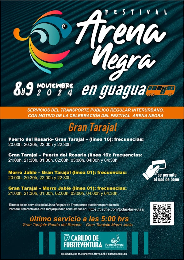 El Cabildo de Fuerteventura, a través de la Consejería de Transportes y la empresa concesionaria que presta el servicio de transporte regular interurbano de viajeros, ponen en marcha una programación especial de guaguas con motivo de la celebración del Festival Arena Negra que tendrá lugar los días 8 y 9 de noviembre.