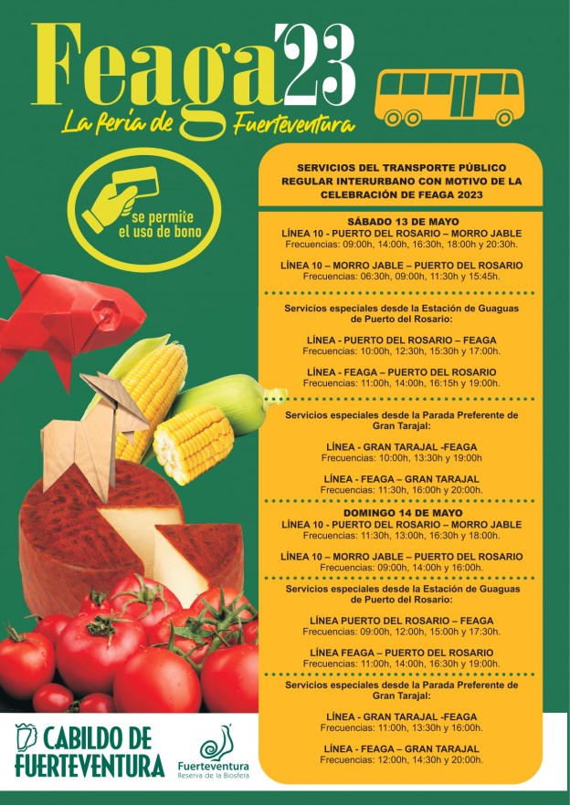 El Cabildo de Fuerteventura, a través de la Consejería de Transportes, Movilidad y Accesibilidad, junto con la empresa concesionaria del transporte regular interurbano de viajeros de Fuerteventura, Tiadhe, han elaborado una programación especial de guaguas para el sábado 13 y domingo 14, con motivo de la Feria de Agricultura, Ganadería y Pesca de Fuerteventura, FEAGA 2023, que se desarrolla en la Granja Agrícola de Pozo Negro.