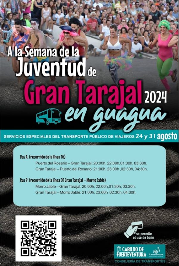 El Cabildo de Fuerteventura, a través de la Consejería de Transportes que dirige Luis González, ha habilitado un servicio especial de transporte de cara a la Semana de la Juventud, que se celebrará en Gran Tarajal desde 24 al 31 de agosto.