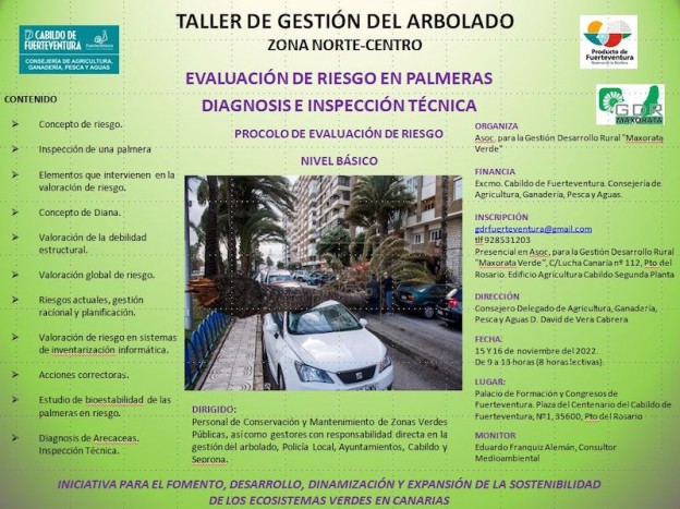 Por su parte, el curso de evaluación de riesgos en palmeras, diagnosis e inspección técnica de nivel básico se impartirá el 15 y el 16 de noviembre en el Palacio de Formación y Congresos, así como el 17 y 18 de noviembre en la Cooperativa Agrícola de Gran Tarajal.