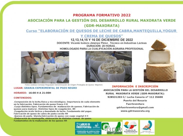 El Cabildo de Fuerteventura, a través de la Consejería de Agricultura, Ganadería y Pesca, que dirige David de Vera, imparte una formación enfocada a la elaboración de quesos de leche de cabra, mantequilla, yogur y crema de quesos. Los cursos tendrán lugar los días 12, 13, 14, 15 y 16 de diciembre, impartidos por el técnico en Industrias Lácteas, Isidoro Jiménez, en la Granja Experimental de Pozo Negro, en horario de 16.00 a 21.00 horas.