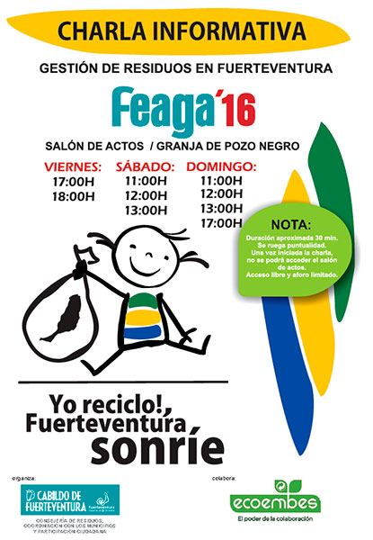 El Cabildo de Fuerteventura, a través de la Consejería de Residuos, Coordinación con los Municipios y Participación Ciudadana, que dirige Luisa Ramos, participará en Feaga 2016, con una serie de charlas informativas sobre gestión de residuos en la Isla, que se impartirán en colaboración con la organización Ecoembes.