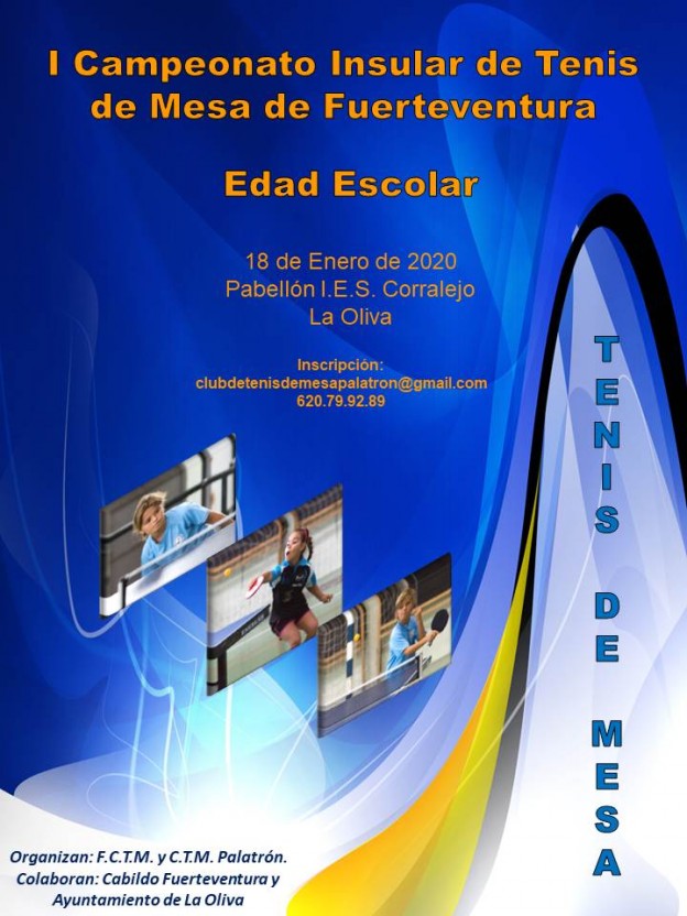 El Cabildo de Fuerteventura, a través de la Consejería de Deportes, informa de la apertura del plazo de inscripción en el I Campeonato Insular en Edad Escolar de Tenis de Mesa, organizado bajo la Delegación Insular de la Federación Canaria de Tenis de Mesa, conjuntamente con el Club Deportivo Palatrón.