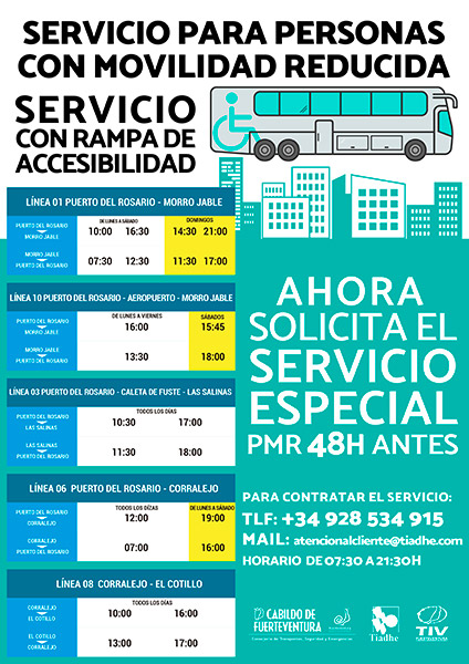 El Cabildo de Fuerteventura y la empresa concesionaria del transporte interurbano de viajeros Tiadhe pondrán en funcionamiento a partir del lunes, 14 de mayo, un servicio especial de guaguas para personas con movilidad reducida. A través de este servicio se establecerán unos horarios para las líneas con mayor frecuencia de usuarios, que serán operados por guaguas que disponen de rampa de accesibilidad.