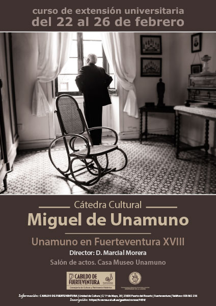 La Cátedra Cultural Miguel de Unamuno se impartirá a partir del próximo lunes, 22 de febrero, en la Casa Museo Unamuno, en Puerto del Rosario. Este curso de extensión universitaria, que organiza la Consejería de Cultura del Cabildo de Fuerteventura, dirigida por Juan Jiménez, en colaboración con la Universidad de La Laguna, será impartido hasta el próximo 26 de febrero, con una duración total de 20 horas.