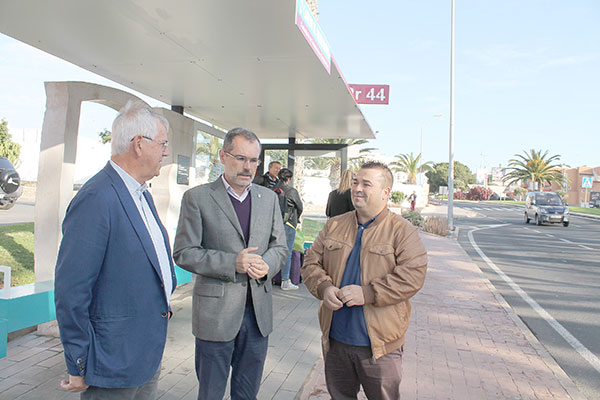 El Cabildo de Fuerteventura ha instalado en el municipio de Puerto del Rosario dos nuevas marquesinas más amplias y con más zona de sombra. Una de las marquesinas se encuentra en la trasera del Centro Comercial Las Rotondas y la otra en la salida hacia Tetir. Ambas estructuras mejorarán la estética del entorno y aportarán comodidad a usuarios del servicio de transporte regular. El presidente del Cabildo de Fuerteventura, Marcial Morales, el alcalde de Puerto del Rosario, Nicolás Gutiérrez, y el consejero de Transportes, José Roque Pérez, visitaron ambas marquesinas.
