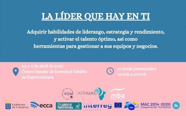 La actividad lleva como título ‘La líder que hay en ti’, y parte de la iniciativa AFRIMAC 2, que se articula desde el departamento de proyectos estratégicos del Cabildo, coordinado por Lola García. La acción formativa se imparte, además, de la mano de Fundación Escuela de Negocios MBA que se dedica al desarrollo, la formación y la investigación en el mundo de la empresa.