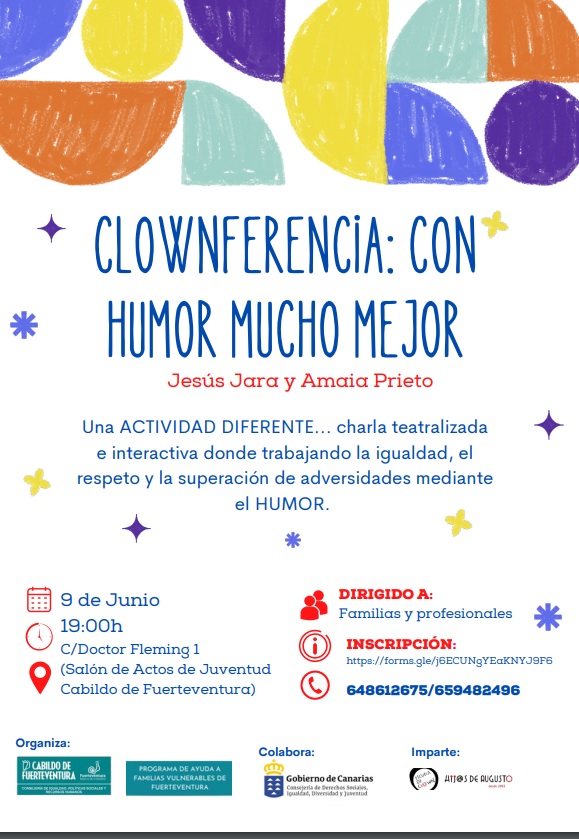 El Cabildo de Fuerteventura, a través de la Consejería de Políticas Sociales, ofrecerá una charla teatralizada e interactiva, dirigida a familias y profesionales, para trabajar la igualdad, el respeto y la superación de adversidades mediante el humor. Bajo el título Clownferencia ‘Con Humor mucho Mejor’, la actividad parte del programa de ayuda a familias del área de Políticas Sociales y tendrá lugar el próximo jueves, 9 de junio, a las 19.00 horas, en el Salón de Actos del Centro Insular de Juventud.