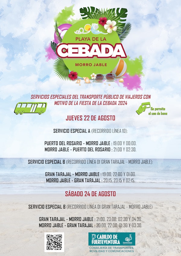 El Cabildo de Fuerteventura, a través de la Consejería de Transportes y la empresa Next Continental Holdings, SL., han habilitado un servicio especial de transporte público con motivo de la Semana Cultural Playa de La Cebada 2024, que se celebra en Morro Jable, del 19 al 25 de agosto.
