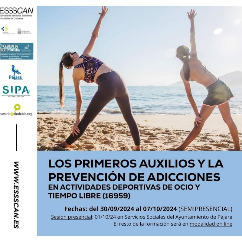 El Servicio de Prevención e Información de Adicciones (SIPA) de la Consejería de Acción Social, que dirige Víctor Alonso, en colaboración con el Ayuntamiento de Pájara, a través de la Concejalía de Servicios Sociales que dirige Kathaisa Rodríguez, y la Escuela de Servicios Sanitarios y Sociales de Canarias (ESSSCAN), organizan el curso gratuito ‘Los Primeros Auxilios y la Prevención de Adicciones en Actividades Deportivas de Ocio y Tiempo Libre’.