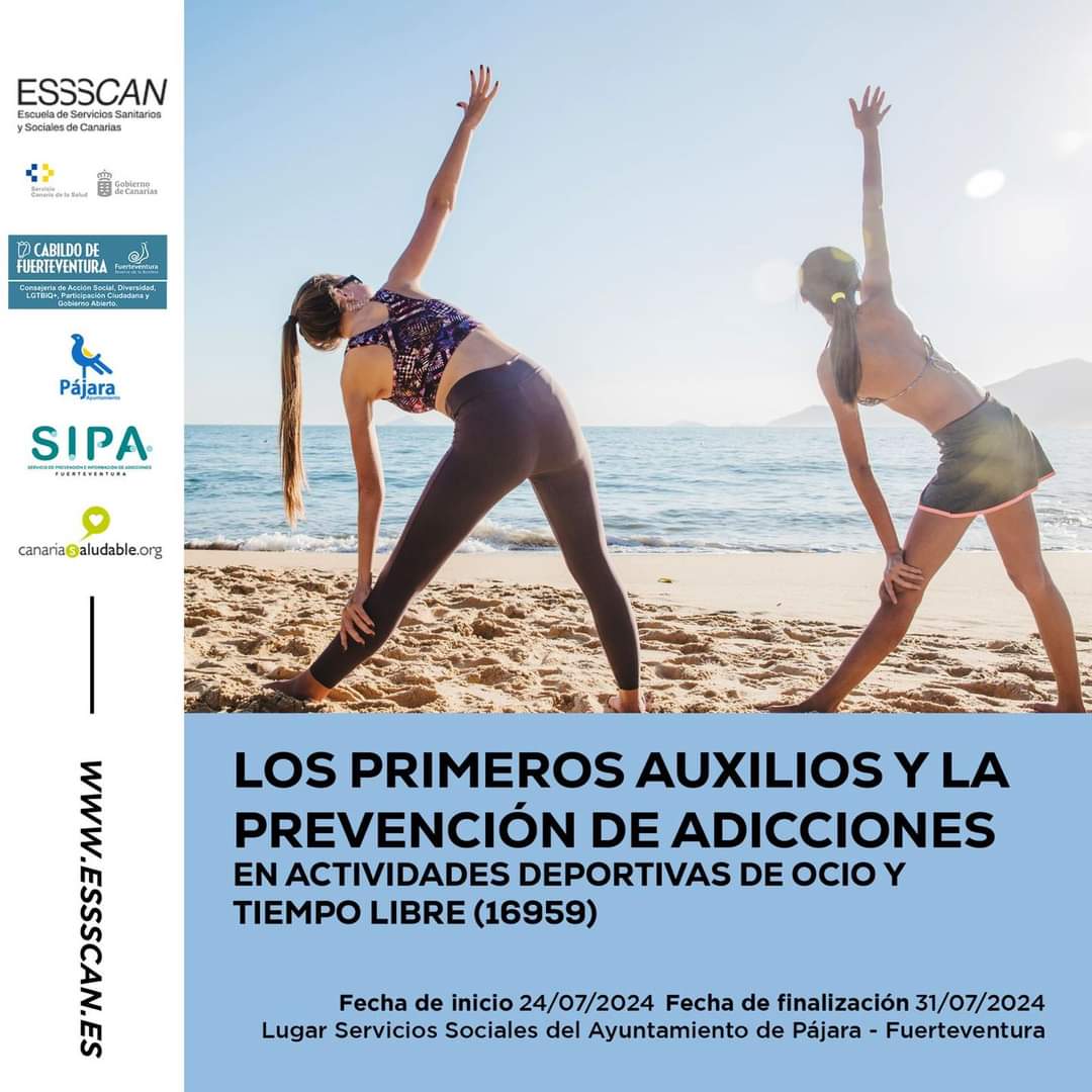 El Servicio de Prevención e Información de Adicciones (SIPA) de la Consejería de Acción Social, que dirige Víctor Alonso, en colaboración con el Ayuntamiento de Pájara, a través de la Concejalía de Servicios Sociales que dirige Kathaisa Rodríguez, y la Escuela de Servicios Sanitarios y Sociales de Canarias (ESSSCAN), organizan el curso gratuito ‘Los Primeros Auxilios y la Prevención de Adicciones en Actividades Deportivas de Ocio y Tiempo Libre’.