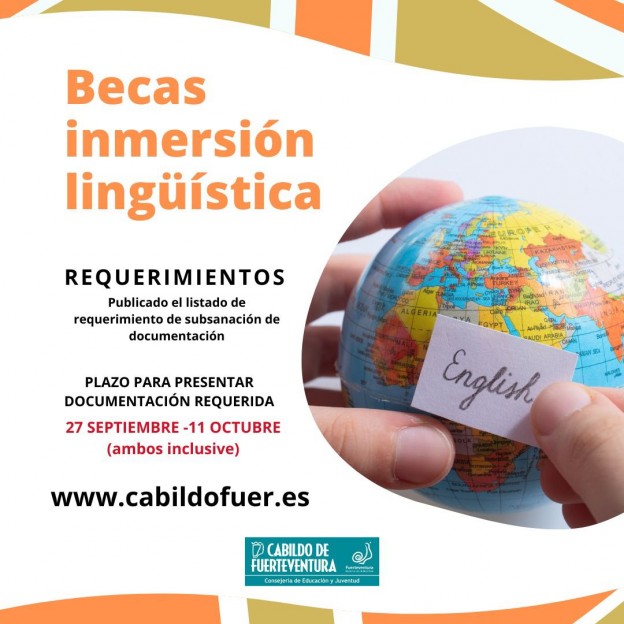 La Consejería de Educación y Juventud del Cabildo de Fuerteventura, que dirige María Saavedra, informa de que ya está publicado el listado de requerimientos a los solicitantes de las Becas de Inmersión Lingüística, convocatoria que el Cabildo de Fuerteventura saca por primera vez. El plazo de subsanación estará abierto desde hoy martes, 27 de septiembre, hasta el próximo 11 de octubre, ambos inclusive.