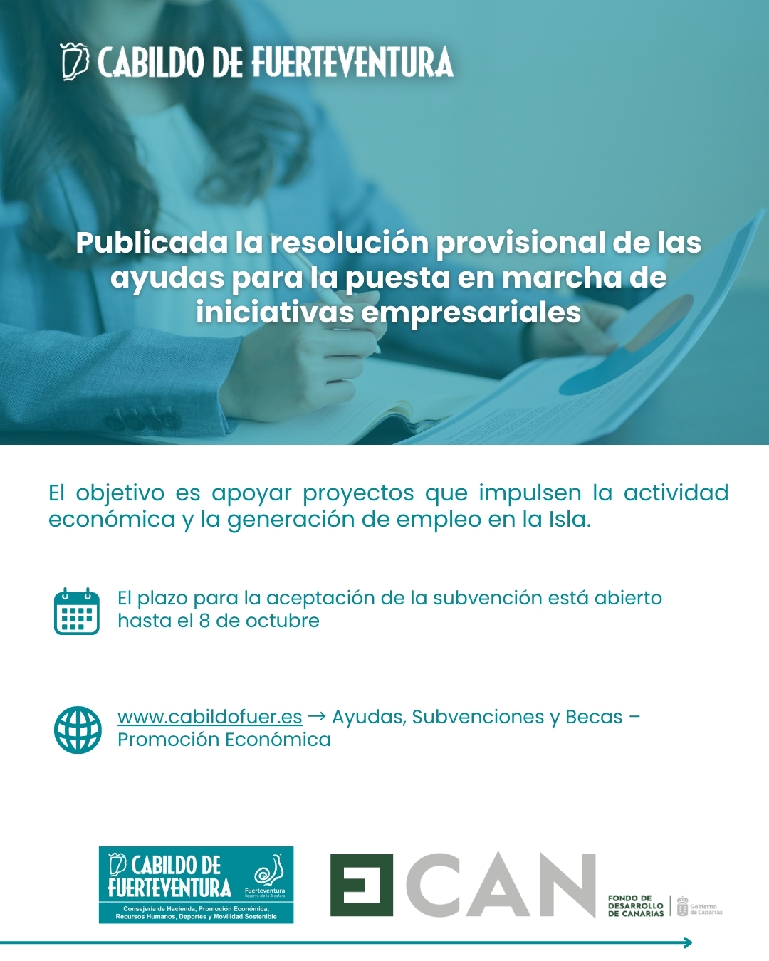 Las personas interesadas tienen hasta el 8 de octubre para aceptar la subvención concedida. Toda la información puede ser consultada en la web del Cabildo: https://www.cabildofuer.es/cabildo/atencion-al-ciudadano/ayudas-becas-y-subvenciones/promocion-economica/subvenciones-para-la-puesta-en-marcha-de-iniciativas-empresariales/iniciativas-empresariales-2025/