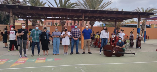 El Cabildo de Fuerteventura, a través de la consejería de Educación y Juventud, apuesta fuerte por fomentar la cultura musical como herramienta de inclusión, enseñándola en la escuela desde edades tempranas y haciéndola extensiva a las unidades familiares. Para ello, ha subvencionado con 60.870 euros el proyecto didáctico Barrios Orquestados, que se desarrolla en el CEIP Poeta Domingo Velázquez, de El Matorral. El presidente de la Institución insular, Sergio Lloret López, la vicepresidenta primera, Lola García, y la consejera de Educación y Juventud, María Saavedra, visitaron hace unos días a su comunidad educativa, con cuyos integrantes conocieron de primera mano la iniciativa. La ayuda otorgada cubre el cien por cien del presupuesto de la actividad, que incluye asimismo a las familias de las y los escolares, de modo que el desarrollo de la educación y su aprendizaje tengan lugar de forma comunitaria.