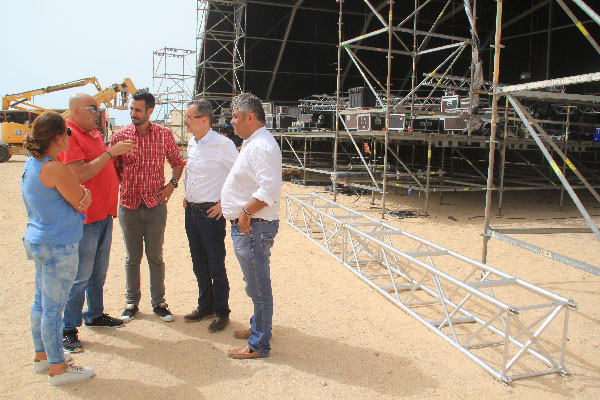 «Fuerteventura tiene consolidado un circuito de eventos culturales y deportivos que pone en valor espacios tan emblemáticos como éste, en El Cotillo», aseguró el presidente del Cabildo de Fuerteventura, Marcial Morales, este martes por la tarde durante la visita que realizó a los trabajos de instalación del escenario en la playa de La Concha. «En colaboración con el Ayuntamiento de La Oliva, la Asociación de Empresarios de El Cotillo y el colectivo Cotillo Joven, el FEM también pone en valor los colectivos empresariales y sociales de este municipio», añadió. «En principio todo está previsto para que el viernes y el sábado para que las noches sean de fiesta y buena música si hubiera cualquier incidente de tipo meteorológico se avisaría con tiempo», aclaró Morales que estuvo acompañado por el alcalde de La Oliva, Isaí Blanco, el consejero de Cultura, Juan Jiménez, el presidente de la Asociación de Empresarios de El Cotillo, Agustín Melián Martín, y una representantes del colectivo Cotillo Joven, aliado de la Reserva de la Biosfera de Fuerteventura.
