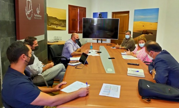 El presidente del Cabildo de Fuerteventura, Sergio Lloret López, y el responsable de Aguas y consejero delegado del Consorcio de Abastecimiento de Aguas a Fuerteventura (CAAF), David de Vera, se han reunido hoy, jueves, 22 de abril, con representantes del Consejo de Administración y de la Junta de Administradores de Eólica de Fuerteventura para analizar el futuro del parque eólico de Cañada de la Barca. Con esta instalación, el CAAF fue pionero, tanto a nivel nacional como europeo, en la apuesta por el binomio agua-energía para la producción de agua de calidad, utilizando para ello energías renovables y, concretamente, la eólica. Un parque que está llegando actualmente al final de su vida útil, y cuyo futuro se analizó en el encuentro hoy mantenido.