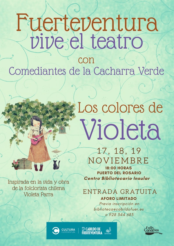 El Centro Bibliotecario Insular acoge los próximos 17, 18 y 19 de noviembre, a las 18.00 horas, el espectáculo familiar ‘Los Colores de Violeta’ de Comediantes de la Cacharra Verde, dentro de la programación cultural del Cabildo de Fuerteventura. Esta pieza de teatro educativo está inspirada en la vida y obra de la cantautora Violeta Parra, con entrada totalmente gratuita, previa inscripción a través del correo electrónico biblioteca@cabildofuer.es o el teléfono 928 344 683.