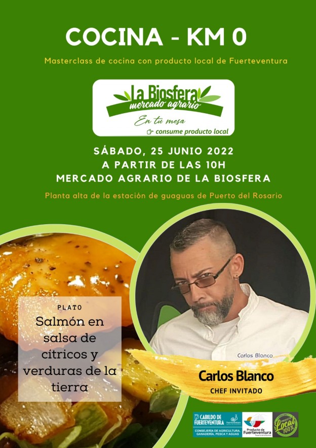 El Mercado Agrario de la Biosfera acoge mañana sábado, día 25 de junio, a partir de las 10.00 horas, una nueva masterclass de cocina. En esta ocasión, el chef invitado es Carlos Blanco, quien preparará un plato de salmón en salsa de cítricos y verduras de la tierra.