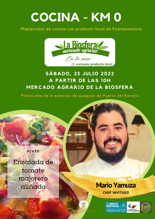 El Mercado Agrario de la Biosfera recuerda que mañana, sábado, día 23 de julio, a las 10.00 horas, tendrá lugar la próxima sesión de su programación de masterclass de cocina. En este caso estará protagonizada por el chef Mario Yamuza, perteneciente a la asociación Fuertegourmet y artífice del proyecto culinario Tagoro Gastrotasca (Puerto del Rosario).