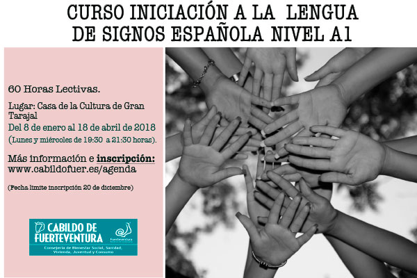 El Cabildo de Fuerteventura ha modificado la fecha de celebración del Curso de Iniciación a la Lengua de Signos Española Nivel A1, cuyo inicio estaba programado para este mes de noviembre. La oferta formativa se imparte finalmente del 8 de enero al 18 de abril. Las personas interesadas tienen hasta el próximo 20 de diciembre para inscribirse, a través de la página web www.cabildofuer.es/agenda.