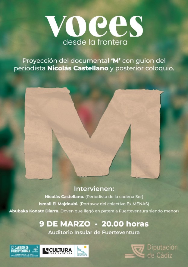 El ciclo ‘Voces desde la Frontera’, coordinado por el periodista Eloy Vera, acogerá el próximo jueves, 9 de marzo, la proyección del documental ‘M’, un trabajo audiovisual con guión del periodista de la cadena Ser Nicolás Castellano que muestra la realidad de cientos de menores que llegan a España en busca de un futuro que los aleje de la miseria o la guerra.
