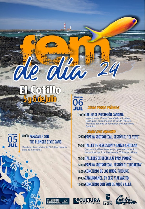 Fuerteventura en Música (FEM) 2024 contará los días 5 y 6 de julio con una variada programación de actividades de día, organizada por el Cabildo de Fuerteventura y la Asociación Cotillo Joven. De esta manera, se ofrece una propuesta diurna de actividades culturales que servirán de complemento al festival, dinamizando el casco antiguo y urbano de El Cotillo, “un pueblo que, tradicionalmente, ha contado con mucha implicación y participación cultural”, explica el consejero de Cultura, Rayco León.