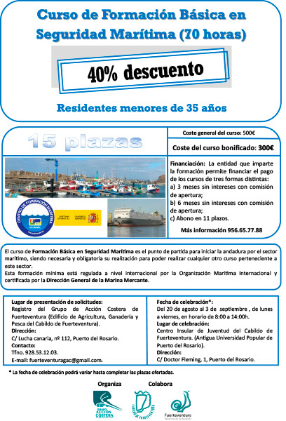 El Grupo de Acción Costera de Fuerteventura (GAC-FTV), que preside el consejero de Agricultura, Ganadería y Pesca del Cabildo de Fuerteventura, Juan Estárico, ofrece un curso de formación básica en Seguridad Marítima, cuya inscripción y plazo de presentación de solicitudes ya están abiertos. El curso, de 70 horas lectivas, se celebrará del próximo lunes, 20 de agosto al viernes, 3 de septiembre, de lunes a viernes, en horario de 8:00 a 14:00 horas, y tendrá lugar en el Centro Insular de Juventud del Cabildo de Fuerteventura, ubicado en la antigua Universidad Popular de Puerto del Rosario, en la calle Doctor Fleming, 1 de Puerto del Rosario. Tiene un coste de 500 euros, y una bonificación de 200 euros para aquellas personas que reúnan determinados requisitos.