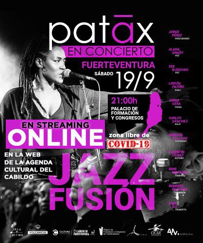 El grupo de jazz fusión Patãx, uno de los proyectos musicales más veteranos y rompedores en su género del panorama nacional e internacional, ofrecerá este sábado, día 19 de septiembre, a partir de las 21.00 horas, un concierto en streaming desde el Palacio de Formación y Congresos de Fuerteventura, a través de la agenda cultural de la web del Cabildo de Fuerteventura, www.cabildofuer.es.
