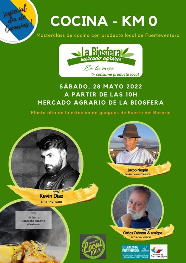 El Mercado Agrario de la Biosfera ofrece este sábado, día 28 de mayo, una programación especial en el marco de la celebración del Día de Canarias (30 de mayo) que incluye masterclass de cocina, actuación musical y una charla sobre vino ecológico.