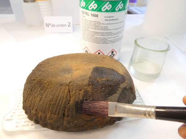 La alteración más importante que presentaba era la elevada erosión de la superficie exterior, acompañada de una importante laminación en diversos puntos del galbo y los mamelones. Presentaba, asimismo, varias grietas longitudinales. Una vez analizadas las pastas y el estado de la cerámica, se han llevado a cabo intervenciones de conservación, como la consolidación de la superficie erosionada, el arreglo de las fisuras y la consolidación de las laminaciones.